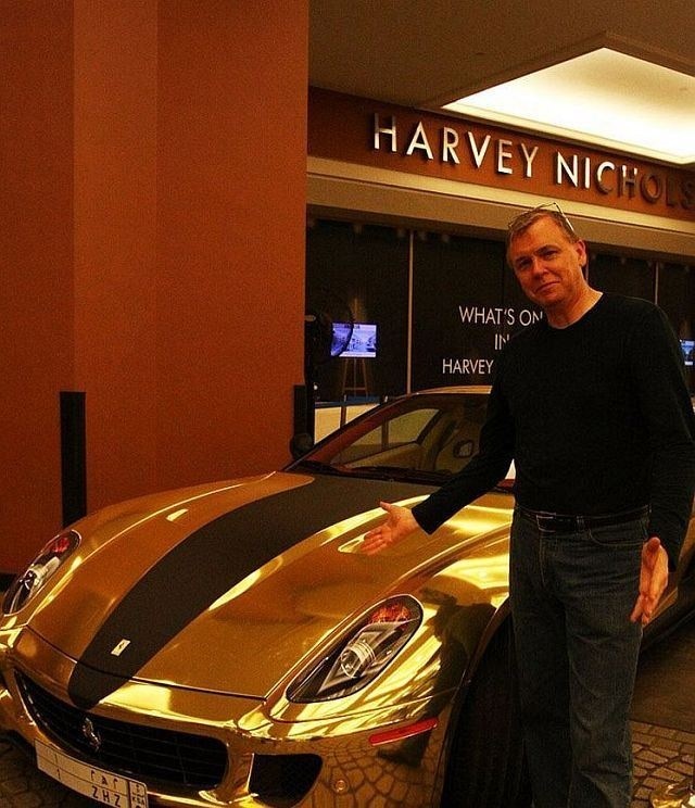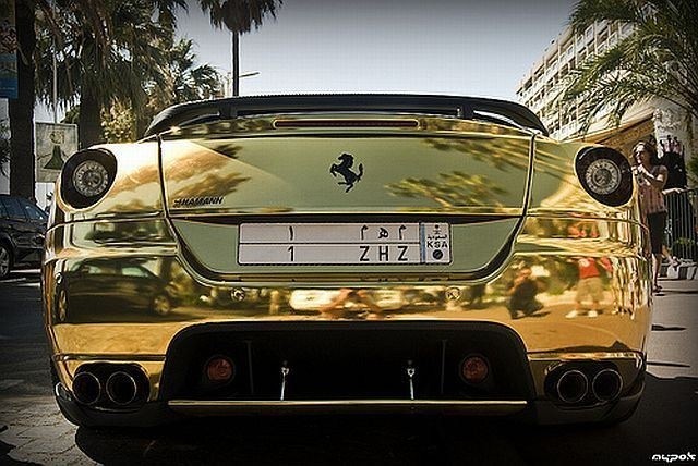 さすが石油もってる人は違うというかなんというか、アラブの大富豪にして、jumierah hotelのオーナーが特注したという、黄金のフェラーリ599 GTBなんだそうだ。