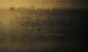 湖畔に停まる水着陸する飛行機から右にカメラが移動、よく見れば何やら黒い点(1枚目) がスーッと右→左に移動する。