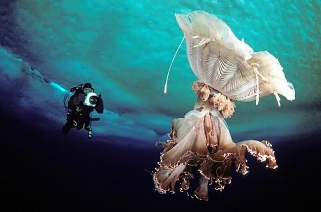 A scyphomedusa, the largest plankton in Antarctic Ice, has tentacles over 9m in length and its bell can reach over 1m in diameter.
