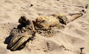 もっと面白い提案では、恐竜またはネス湖の怪物かもしれないと言います。家族とともにビーチを歩いていた、地元の男性 David Mackland は未知のものを発見、見つけ(found the discovery) ました。「私達は 浜に沿って歩いていた時 未知のものを発見、これを見つけた。私はそれが 4から5 フィート(1.524m) と長く、幅もおよそ1フィート(30.48cm) はあったと言っておきます。それは十分 大きかった。歯は、直ぐ見ることができました。」彼はそう述べました。