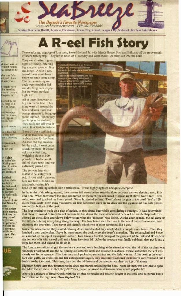 it went crazy, attacking then. it was an eel over 6 feet long.weighting close to 100 pounds.it had a mouth full of sharp teeth and was extremely pissed off.the eel was later esti-mated to be sixty years old.(¤½¤ì¤Ï¡¢¥¯¥ì¥¤¥¸¡¼¤À¤Ã¤¿¡£¹¶·â¤·¤Æ¤¤¿¡£6 ¥Õ¥£¡¼¥È(1.8288m) °Ê¾å¤ÎŤ¤¥¦¥Ê¥®¤À¤Ã¤¿¡£½Å¤µ¤Ï 100 ¥Ý¥ó¥É¶á¤¯¤¢¤ê¤Þ¤¹¡£±Ô¤¤»õ¤Î´°Á´¤Ê¸ý¤ò»ý¤Ã¤Æ¤¤¤¿¤·¡¢Èó¾ï¤ËÊ¢¤òΩ¤Æ¤Æ¤¤¤¿¡£¥¦¥Ê¥®¤Ï¡¢60ºÍ¤Ç¤¢¤ë¤È¸å¤Ë¿äÄꤵ¤ì¤Þ¤·¤¿¡£)