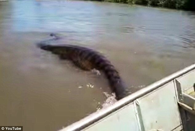 ブラジルのMato Grosso do Sul stateのSanta Maria川での3人組の釣りは、彼らのボートの横に居る長い、黄色い、17 フィートの、泳ぐアナコンダの驚くべき発見をしました。