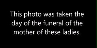 this photo was taken the day of the funeral of the mother of these ladies.(¤³¤Î¼Ì¿¿¤Ï¡¢Èà½÷Åù¤ÎÊì¿Æ¤ÎÁòµ·¤ÎÆü¤Ë»£±Æ¤µ¤ì¤Þ¤·¤¿¡£)you can see a dark, shadowy figure behind he women in the middle with "the hand" on his her shoulder.soon after, she died in a car accident.(Èà½÷¤Î¸ª¤Ë¡Ö¼ê¡×¡¢¿¿¤óÃæ¤Î½÷À¤ÎÇØ¸å¤Ë¡¢°Å¤¤¡¢Ææ¤ËÊñ¤Þ¤ì¤¿¿Í±Æ¤ò¸«¤ë¤³¤È¤¬¤Ç¤¤Þ¤¹¡£¤¹¤°¸å¤Ë¡¢Èà½÷¤Ï¼«Æ°¼Ö»ö¸Î¤ÇË´¤¯¤Ê¤ê¤Þ¤·¤¿¡£)¢¨YouTube