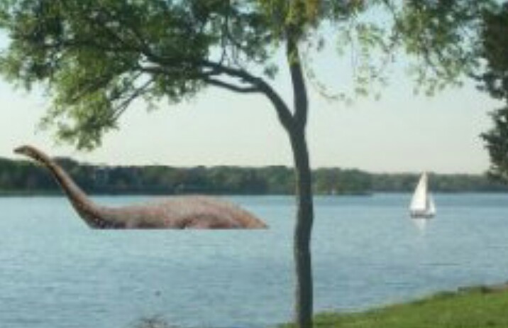 Dallas - April 1, 2004. Recently, a prehistoric creature was spotted at White Rock Lake, just off shore near Winfrey Point. After menacing a sailboat (seen here), it moved toward the dam. It's whereabouts are currently unknown but it is believed it may be hiding in the Old Fish Hatchery. Because the lake is shallow, the huge creature, which appears to be a Diplodocus, seems to be able to make its way across the water by simply walking on the muddy bottom.