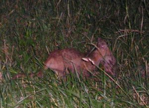 What is it? It was spotted at night by a woman on a highway. She saw it dragging a road kill off into the grass and snapped this picture.(¤½¤ì¤Ï²¿¤Ç¤¹¤«¡©¥Ï¥¤¥¦¥§¥¤¾å¤Î½÷À¤¬ÌëÃæ¤Ë¸«¤Ä¤±¤Þ¤·¤¿¡£Èà½÷¤Ï¤½¤ì¤¬Áð¤à¤é¤Ë íफ¤ì¤¿»à³¼(road kill)¤ò°ú¤Ã¤Ñ¤ê½Ð¤·¤Æ¤¤¤ë¤Î¤ò¸«¤Æ¡¢¤³¤Î¼Ì¿¿¤ò»£¤ê¤Þ¤·¤¿¡£Please note: I cropped, enlarged and enhanced the object in the photo above, from witness' photo.