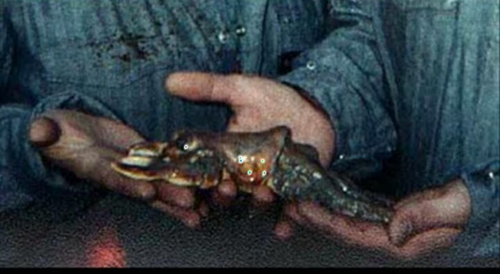 Within minutes, the two procured a canister large enough to accommodate the strange animal. They scooped it out of the drink cup and set it in the vial. Unfortunately, the sludge creature died within minutes. think it might have been the light that killed it," said Susan.(Joe ValoneとSusan Madigan (Merovの従業員)は、使用済みの、革を鞣す為の化学薬品のドラム缶をキレイにし消毒するのを手伝うよう、「Indutech」産業廃棄物除去会社から言われました。多くのタンクの内の1つをきれいにする間、ジョーはタンク内のいくつかの動きに気が付きました。「私は 何かが泳いでいるような動きを見ました、 」ジョーは言いました。何匹かの不幸な動物が 産業廃棄物のタンクに落ちたかと思い、スーザンは、近くに在ったタンクから不幸なクリーチャーを掬おう(scooped)と、その「ガブ飲み(Big Gulp)」カップを掴みました。「最初、私は臭いに気付きました。私達が液体からそれを掬うとすぐに、それは変な匂いを発しました。」彼女はカップを覗いて、見たことのないクリーチャーを見ました。「私は自分を消毒したい」彼女は笑いました。「これは、一部イカ、一部カエル、一部カニ、またはそんなような何かだよね」ジョーは言いました。 「私達がそれをヘドロから引き抜くと直ぐに、それは陸に揚がった瀕死の魚のような高速移動を開始しました。私はそれを投げ返したかったです、しかし、私はそれが正しい行為であるかどうかわかりませんでした、そして、とにかく、そのヘドロは『浄化センター』へ行く予定になっていました。」数分以内に2人は、変な動物に適合するに充分な大きさの容器を調達しました。彼らは飲物カップからそれを掬って小瓶にセットしました。残念なことにヘドロクリーチャーは数分で死にました。「私は、それを殺したのは光であったかもしれないと思います」と、スーザンは言いました。「そのタンク内での隔離のそれらの全ての年月と 光と酸素がちょうど、あまりに多すぎたのかもしれない、どうだか知らないけど」)Please note: I cropped, enlarged and enhanced the object in the photo above, from witness' photo. In addition, zoom assumes a photograph it for the people who are hard to be able to see a small child and old person small thing.